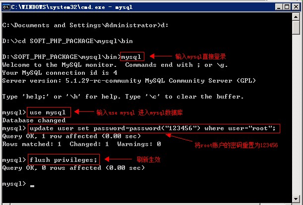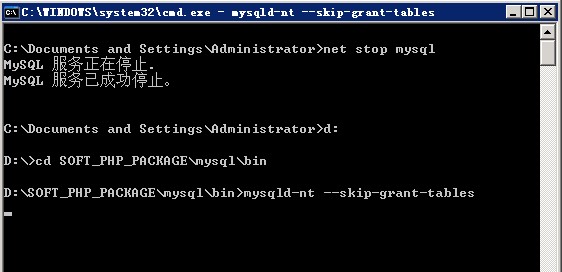 windows/linux 命令行方式重置mysql的root密码Windows环境的找回方法: 1、打开cmd命令窗口,先输入命令: net stop mysql 回车 #关闭mysql服务。 进入到D:\SOFT_PHP_PACKAGE\mysql\bin\ 目录下,执行mysqld --skip-grant-tables 启动MySQL Server (如果报错,执行mysqld-nt --skip-grant-tables)如图:
