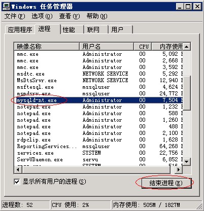 3、关闭两个命令窗口,此时还无法启动mysql因为mysql进程还在运行中,打开任务管理器,找到mysqld开头的进程,点结束进程,如图: