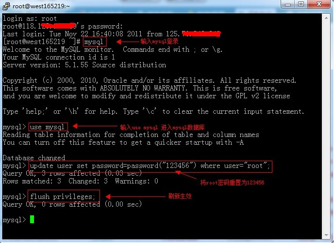 3、 原有的ssh客户端不要关闭(若该客户端超时,可能导致重置密码失败,所以重置密码过程建议在几分钟内完成),新开一个ssh客户端登陆,登陆后输入mysql命令登陆到mysql: >mysql 然后输入以下命令重置密码: 如图: