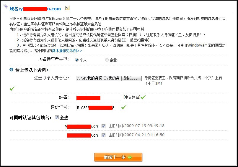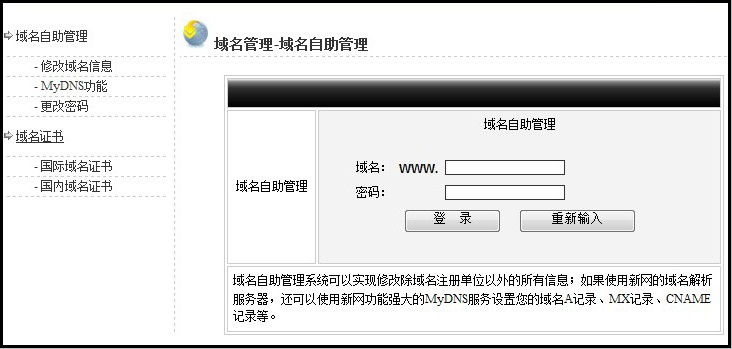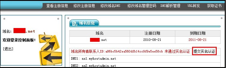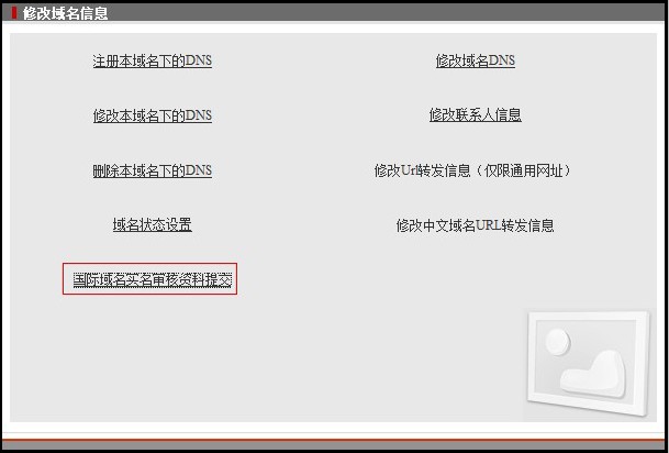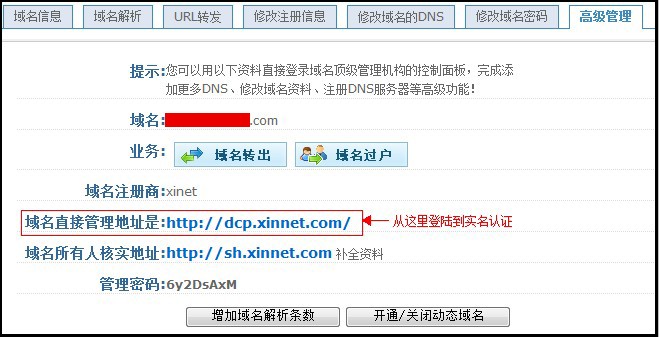 2. 注册商为“新网”: 在我司域名控制面板中点击“立即提交实名认证”,在线提交资料。然后点域名控制面板中点“高级管理”,根据高级管理中显示的管理密码,登录:http://dcp.xinnet.com/ 登录后在“域名管理”中 提交国际域名实名认证材料。 3. 注册商为“商务中国” 在我司域名控制面板中点击“立即提交实名认证”,在线提交资料。然后点域名控制面板中点“高级管理”,根据高级管理中显示的管理密码,登录: http://cache.cdncache.net/ 登录后 提交实名认证 。