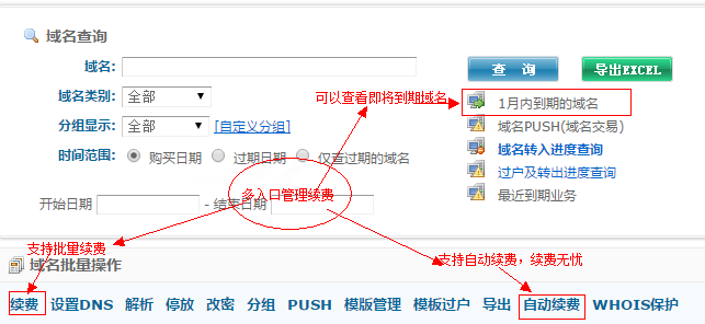 2、支持多种方式选择域名续费: 在域名管理界面中,选择【1个月内到期的域名】-可以查看近期不同时间到期的域名以续费;选择【域名批量操作-续费】或【域名批量操作-自动续费】可以批量对多个域名续费。